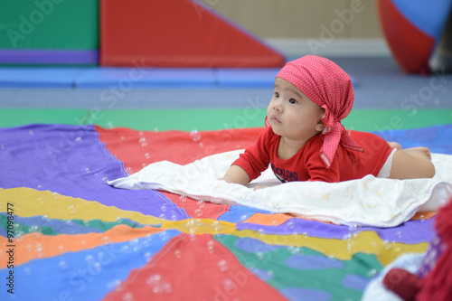 © PeterO, Obraz premium Adorable baby look colorful balloons living room.