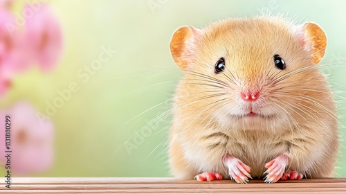 Fototapeta premium Adorable Baby Mouse on Wooden Deck Spring Background