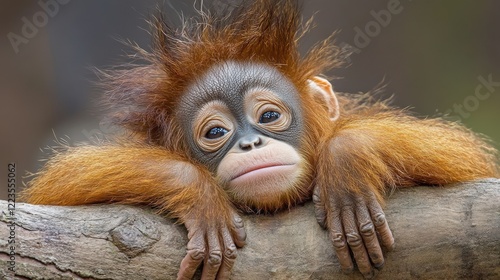 Fototapeta premium Adorable baby orangutan resting on tree branch in natural habitat