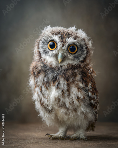 Obraz premium Adorable baby owl chick with bright eyes in sharp macro close-up on neutral...