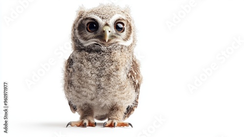 © Thavesak, Fototapeta premium Adorable Baby Owl Perched on Branch Against White Background with Soft Shadows - Cute Wildlife Concept