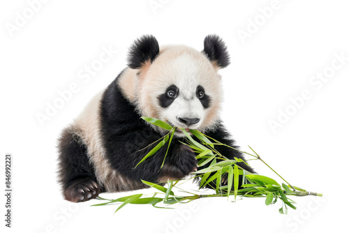 © Rattanathip, Naklejka premium Adorable baby panda chewing on bamboo sticks, isolated on a transparent background. Perfect for wildlife and nature themes.