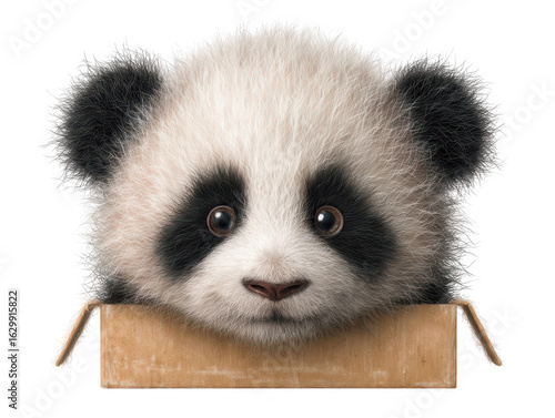 © hatam, Naklejka premium Adorable baby panda cub peeking from a cardboard box isolated transparent background