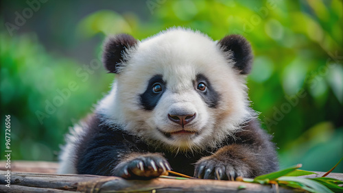 Fototapeta premium Adorable baby panda in a playful pose , panda, cub, animal, wildlife, cute, furry, black and white, bamboo, nature, endangered