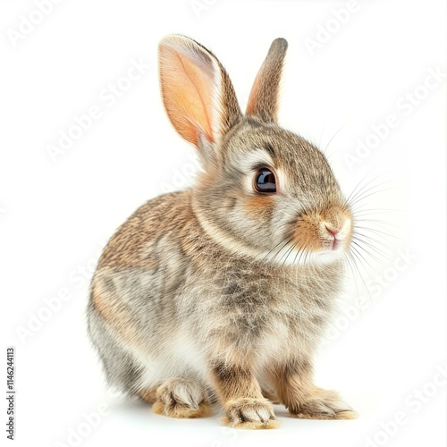 Obraz premium Adorable baby rabbit sitting and looking curious on a seamless white background