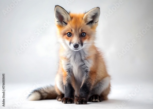 © ARIFUZZAMAN, Obraz premium Adorable baby red fox with fluffy fur sitting on a clean white background looking directly at the camera 1