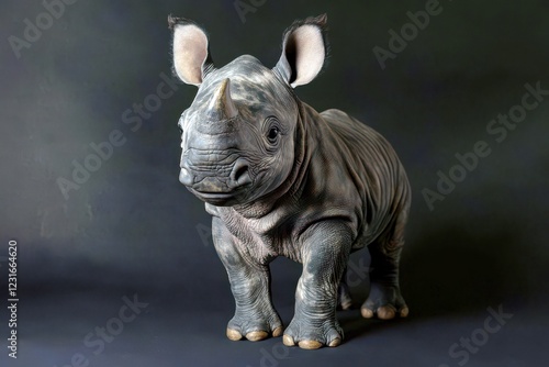 Fototapeta premium Adorable baby rhinoceros standing against a dark background showcasing its unique features, textures, and playful expression in a studio setting