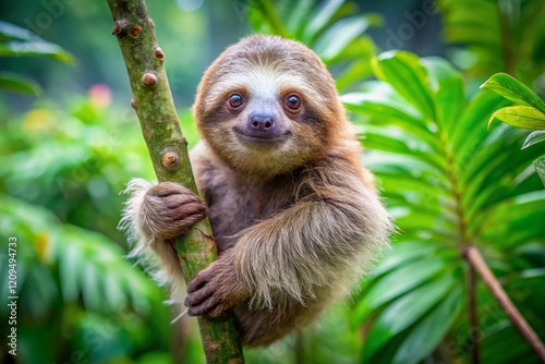 Fototapeta premium Adorable Baby Sloth Hanging on Branch - Wildlife Stock Photo