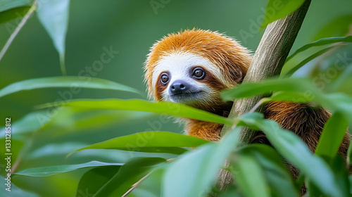 Naklejka premium Adorable baby sloth peering from lush green foliage