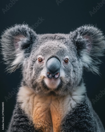 © Iuliia, Fototapeta premium Adorable baby wild koala with rim lighting close-up against dark background in natural habitat