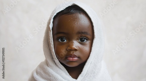 Obraz premium Adorable baby wrapped in a towel with soft skin against a neutral backdrop conveying innocence and warmth. Perfect for family and childhood themes.