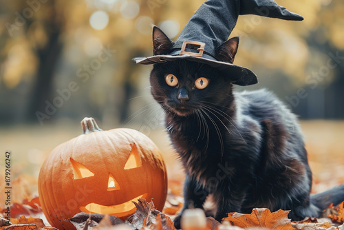 Naklejka premium adorable black cat in witch hat with halloween pumpkin in autumn park