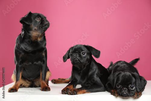 © New Africa, Obraz premium Adorable black Petit Brabancon dogs on white table against pink background