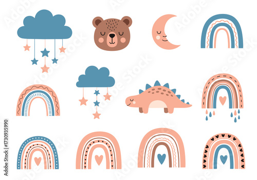 Fototapeta premium Adorable boho nursery elements featuring clouds stars moon bear and dinosaur rainbows.