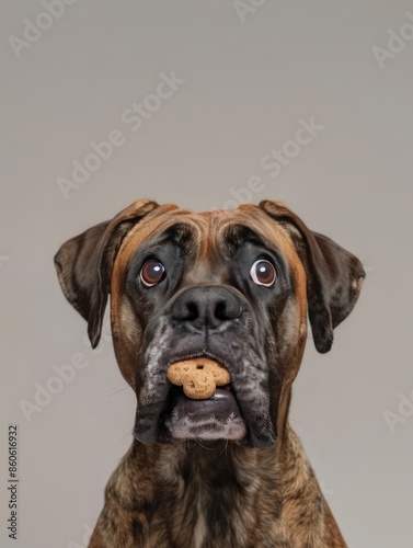 © Steveandfriend, Obraz premium Adorable boxer dog with a surprised expression holding a biscuit in its mouth against a plain background.