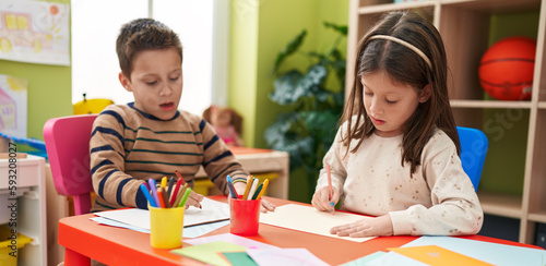 Fototapeta premium Adorable boy and girl preschool students sitting on table drawing on paper at...