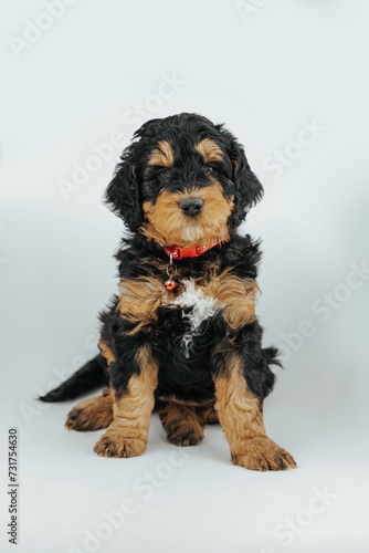Fototapeta premium Adorable brown and black Berniedoodle puppy in the studio against a white background