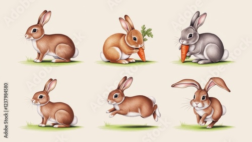 Naklejka premium Adorable Brown and Grey Rabbits Sitting Eating Carrots Jumping Cute Bunny Illustrations
