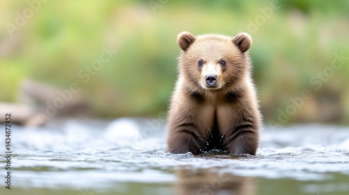 © PAPAHJAHATZ, Fototapeta premium Adorable brown bear cub wading in a river
