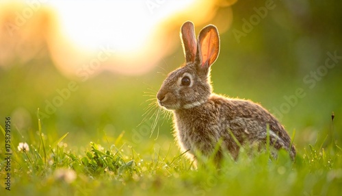 Fototapeta premium Adorable brown bunny backlit by golden hour sunlight in a field.
