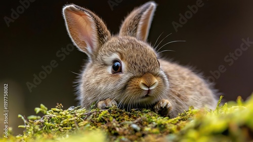 Fototapeta premium Adorable brown bunny in mossy forest, wildlife closeup