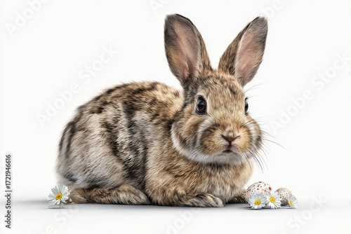 Fototapeta premium Adorable brown bunny rabbit sitting near Easter eggs and daisies on white...