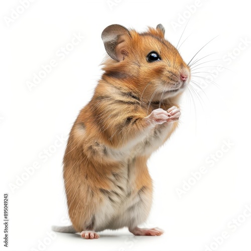 © Suphakorn, Fototapeta premium Adorable brown hamster standing on its hind legs against a white background, showcasing its whiskers and tiny paws.