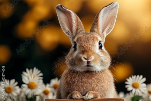 © Maggi, Obraz premium Adorable brown rabbit with large ears surrounded by daisies in a sunny meadow
