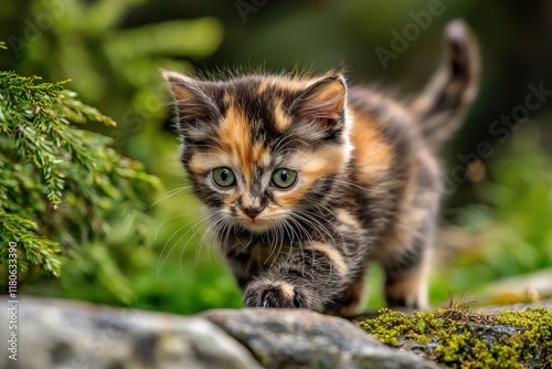 Obraz premium Adorable Calico Kitten Explores Nature Garden Wildlife