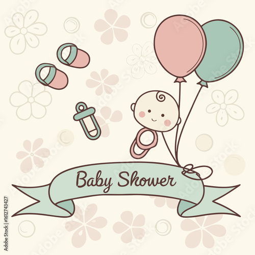 Fototapeta premium Adorable card design featuring pacifiers, bibs, strollers, and baby bottles in soft pastel shades.