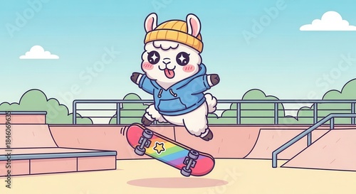 © Ariestia, Obraz premium Adorable cartoon alpaca performs a trick while riding a colorful skateboard at an outdoor park