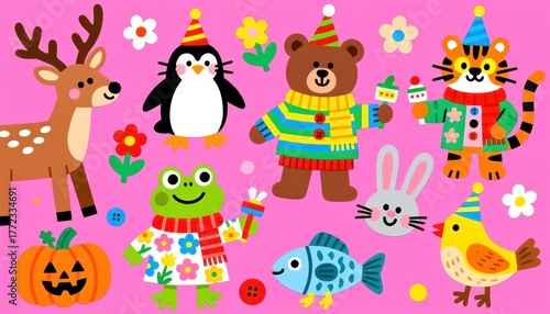 © Angelo, Naklejka premium Adorable cartoon animal characters celebrating a birthday party isolated on pink background, featuring a deer, bear, and tiger