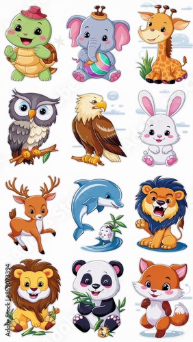 © ZoomTeam, Naklejka premium Adorable Cartoon Animal Stickers Collection Featuring Cute Turtle, Owl, Giraffe, Eagle, Elephant, Deer, Panda, Dolphin, Lion, and Fox Illustrations