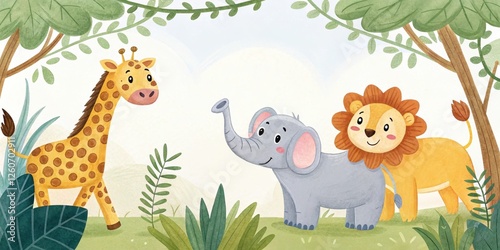 Naklejka premium Adorable Cartoon Animals in a Safari Scene Surrounded by Lush Greenery and Tropical Plants