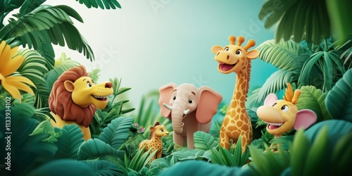 © vector Art, Fototapeta premium Adorable Cartoon Animals in Lush Tropical Jungle Setting A Delightful 3D Render of Playful Wildlife Amidst Vibrant Foliage