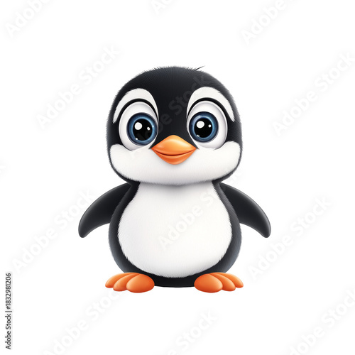 Fototapeta premium Adorable cartoon baby penguin with big eyes and orange feet on white background