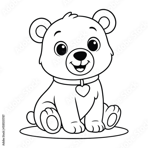 © Alishba, Naklejka premium Adorable Cartoon Bear with Heart Pendant Collar, Black and White Line Art Drawing of a Cute Sitting Teddy Bear Character