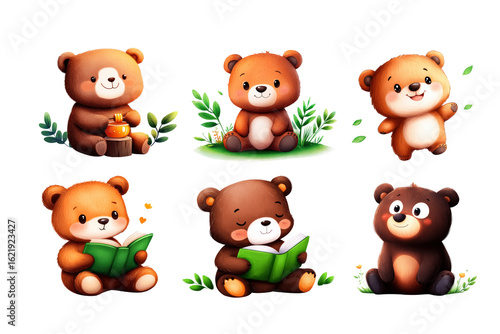 © Foxgrafy, Naklejka premium Adorable cartoon bears reading and enjoying nature