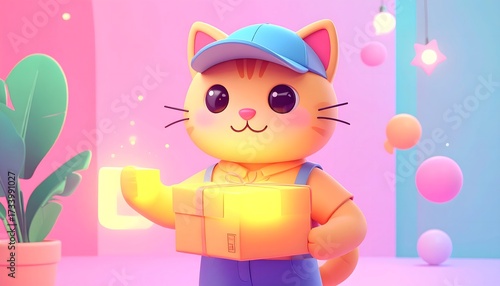 Naklejka premium Adorable Cartoon Cat Mascot Delivering Package with Happy Smile Cute Character for Delivery Service App E commerce Business Package Shipping Creative Mascot Design Digital Art