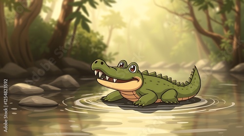 Fototapeta premium Adorable Cartoon Crocodile in a River Forest