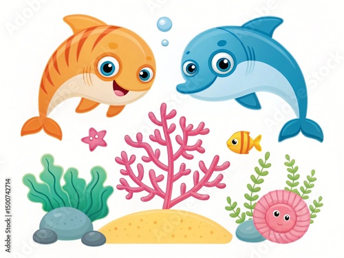 Fototapeta premium Adorable Cartoon Dolphins Fish and Coral Reef Underwater Scene Illustration