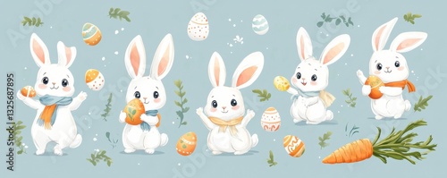 Naklejka premium Adorable cartoon Easter bunnies with colorful eggs and festive decor