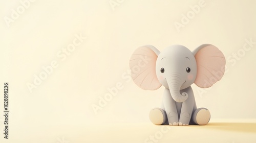 Fototapeta premium Adorable cartoon elephant with big ears and pink cheeks sitting on a light yellow background.