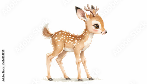 © dapra01, Naklejka premium Adorable Cartoon Fawn with Big Eyes and Small Antlers on White Background