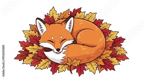 Fototapeta premium Adorable cartoon fox rests curled up cozily among colorful fallen foliage