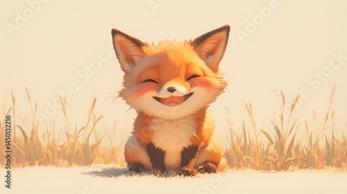 Obraz premium Adorable cartoon fox smiles broadly in a field, bathed in soft, warm light