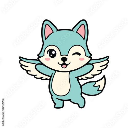 Obraz premium Adorable Cartoon Fox with Wings, Happy Expression, White Background, Teal Fur