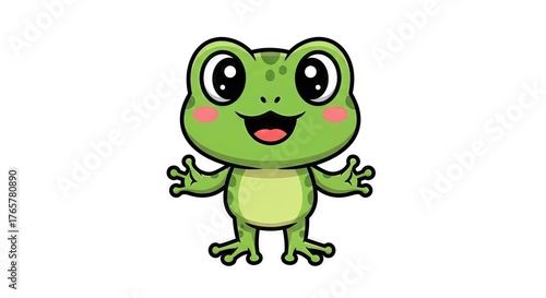 Fototapeta premium Adorable cartoon frog character with cheerful expression against white background