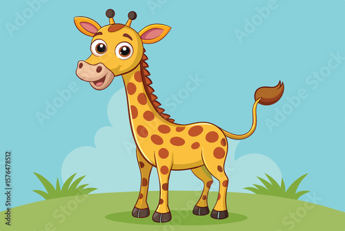 Fototapeta premium Adorable cartoon giraffe with big eyes standing happily in a green outdoor setting. Perfect for childrens content, educational purposes, or playful designs.