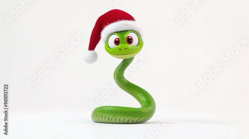 Fototapeta premium Adorable Cartoon Green Snake Wearing a Santa Hat on a White Background,...